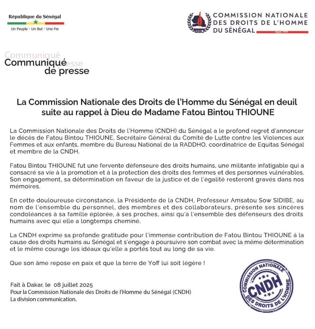 La Commission Nationale des Droits de l'Homme du Sénégal en deuil suite au rappel à Dieu de Madame Fatou Bintou THIOUNE